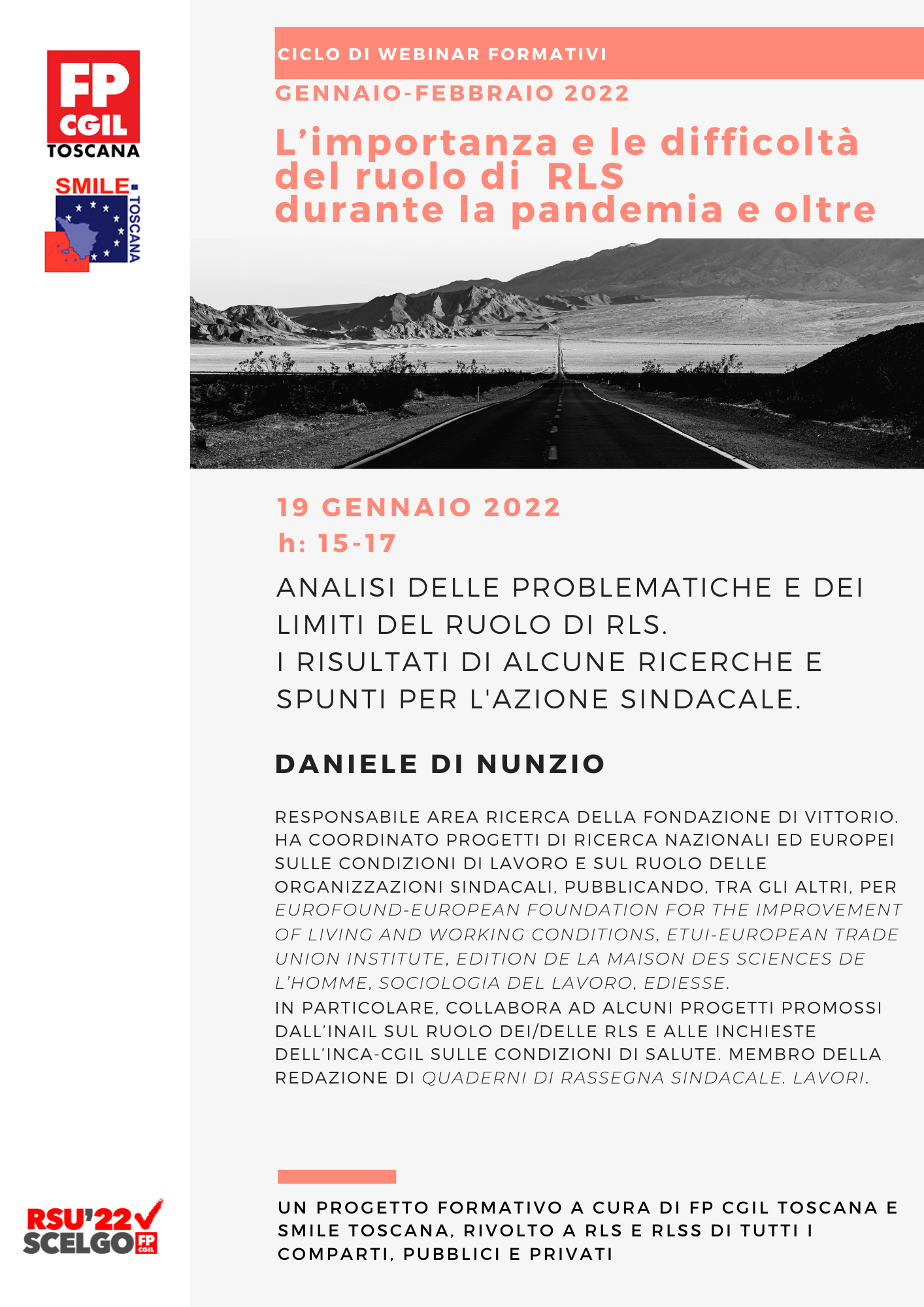Nell’ambito del progetto formativo organizzato da FP-CGIL Toscana e SMILE Toscana rivolto a RLS di tutti i comparti pubblici e privati, Daniele Di Nunzio, Responsabile dell’Area Ricerca della Fondazione Di Vittorio, presenterà i risultati di alcune ricerche sul ruolo dei Rappresentanti dei Lavoratori per la Sicurezza (RLS) al fine di contribuire alla riflessione sulle opportunità e i limiti per l’azione sindacale.