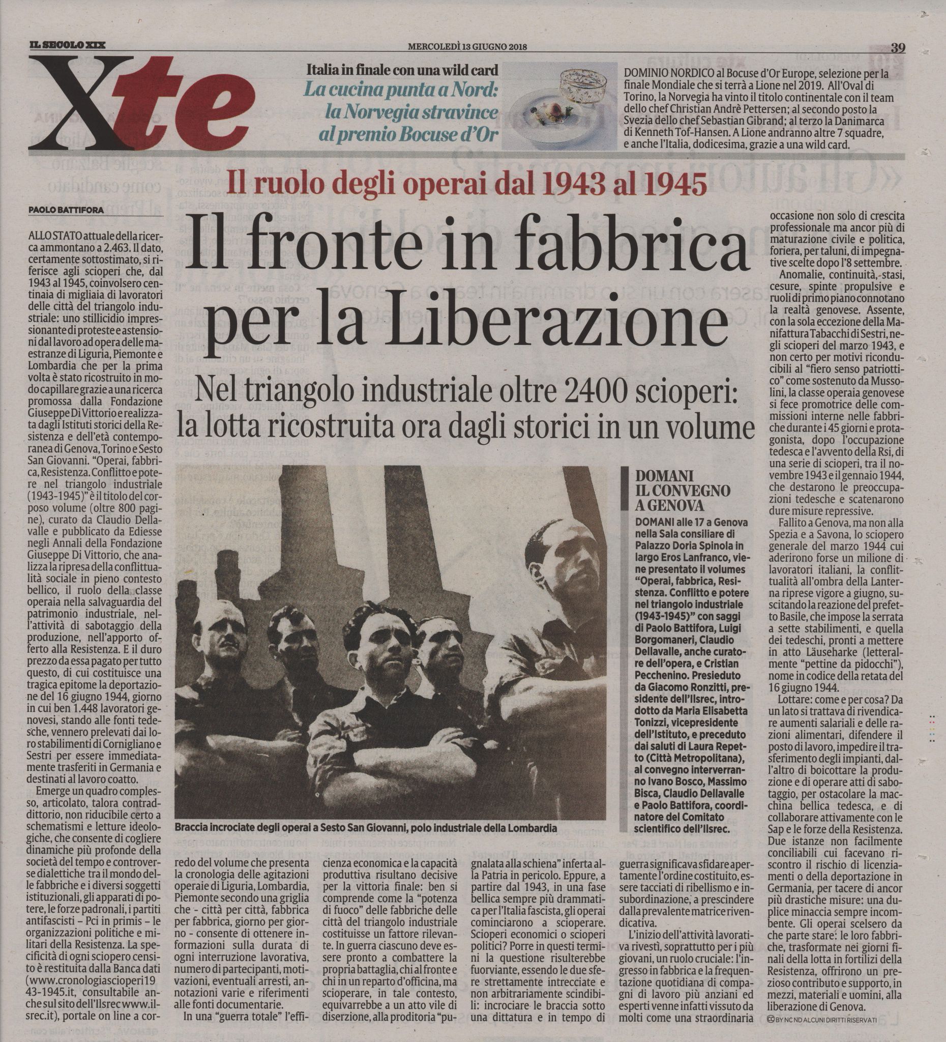 In allegato, l'articolo scritto da Paolo Battifora su "Il Secolo XIX" del 13 giugno in occasione del Convegno, "Operai, fabbrica, Resistenza. Conflitto e potere nel triangolo industriale (1943 – 1945)."