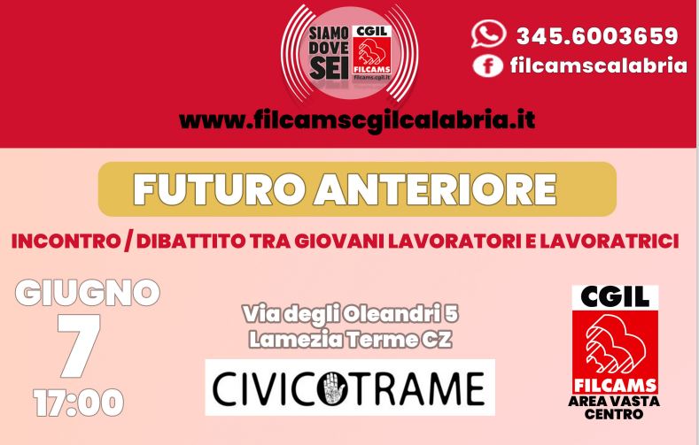 La FILCAMS CGIL Calabria ha organizzato un seminario sulle condizioni di lavoro dei giovani e le prospettive di azione sindacale, il 7 giugno 2023, ore 17.00, presso Civico Trame di Lamezia Terme.
