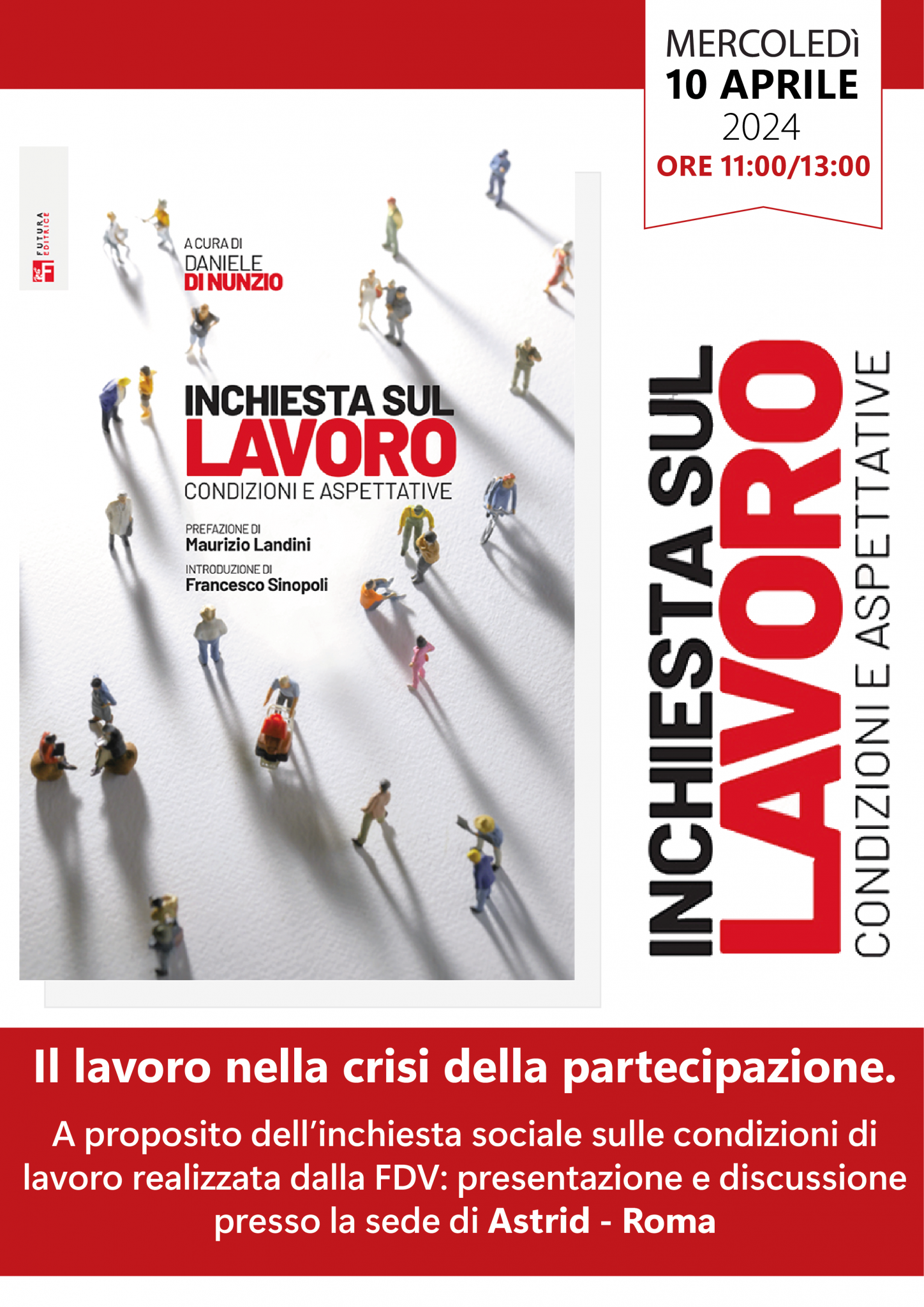 Si svolgerà il giorno mercoledì 10 aprile dalle ore 11 alle 13 il seminario dal titolo “Il lavoro nella crisi della partecipazione. A proposito dell’inchiesta sociale sulle condizioni di lavoro realizzata dalla Fondazione Di Vittorio: presentazione e discussione” prima presentazione del volume “Inchiesta sul lavoro. Condizioni e aspettative” che raccoglie i risultati del questionario che ha raggiunto più di 30.000 lavoratrici e lavoratori di tutti i settori.