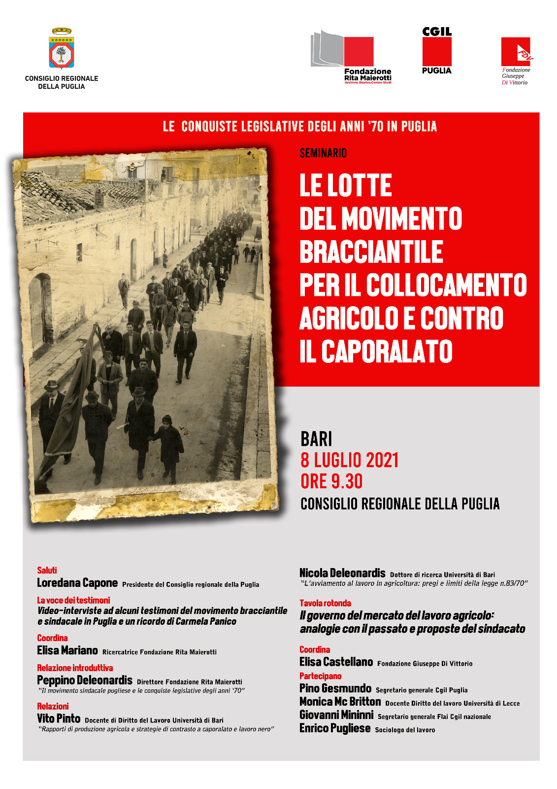Il Seminario, “Le lotte del movimento bracciantile per il collocamento agricolo e contro il caporalato” si svolgerà a Bari giovedì 8 luglio 2021 alle ore 9.30, presso il Consiglio Regionale della Puglia. All’iniziativa organizzata dalla Fondazione Rita Maierotti, dalla CGIL Puglia e dalla Fondazione Giuseppe Di Vittorio, parteciperanno esponenti delle istituzioni, del mondo sindacale, della ricerca e del mondo accademico. In allegato il programma completo.