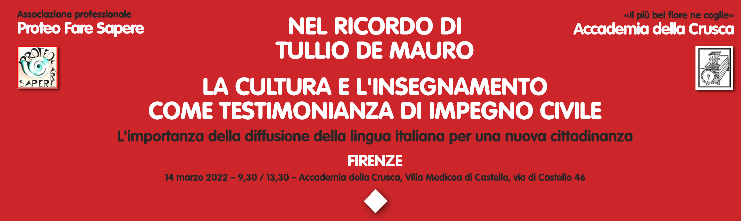 Il 14 marzo 2022, dalle 9.30 alle 13.30, si terrà un incontro organizzato dall'Associazione Proteo Fare Sapere e dall'Accademia della Crusca dal titolo "Nel ricordo di Tullio De Mauro. La cultura e l'insegnamento come testimonianza di impegno civile. L'importanza della diffusione della lingua italiana per una nuova cittadinanza".