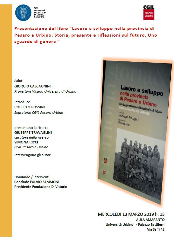 Sarà presentato mercoledì 13 marzo 2019 il libro "Lavoro e sviluppo nella provincia di Pesaro e Urbino. Storia, presente e riflessioni sul futuro. Uno sguardo di genere", curato dal prof. Giuseppe Travaglini e pubblicato da Ediesse.