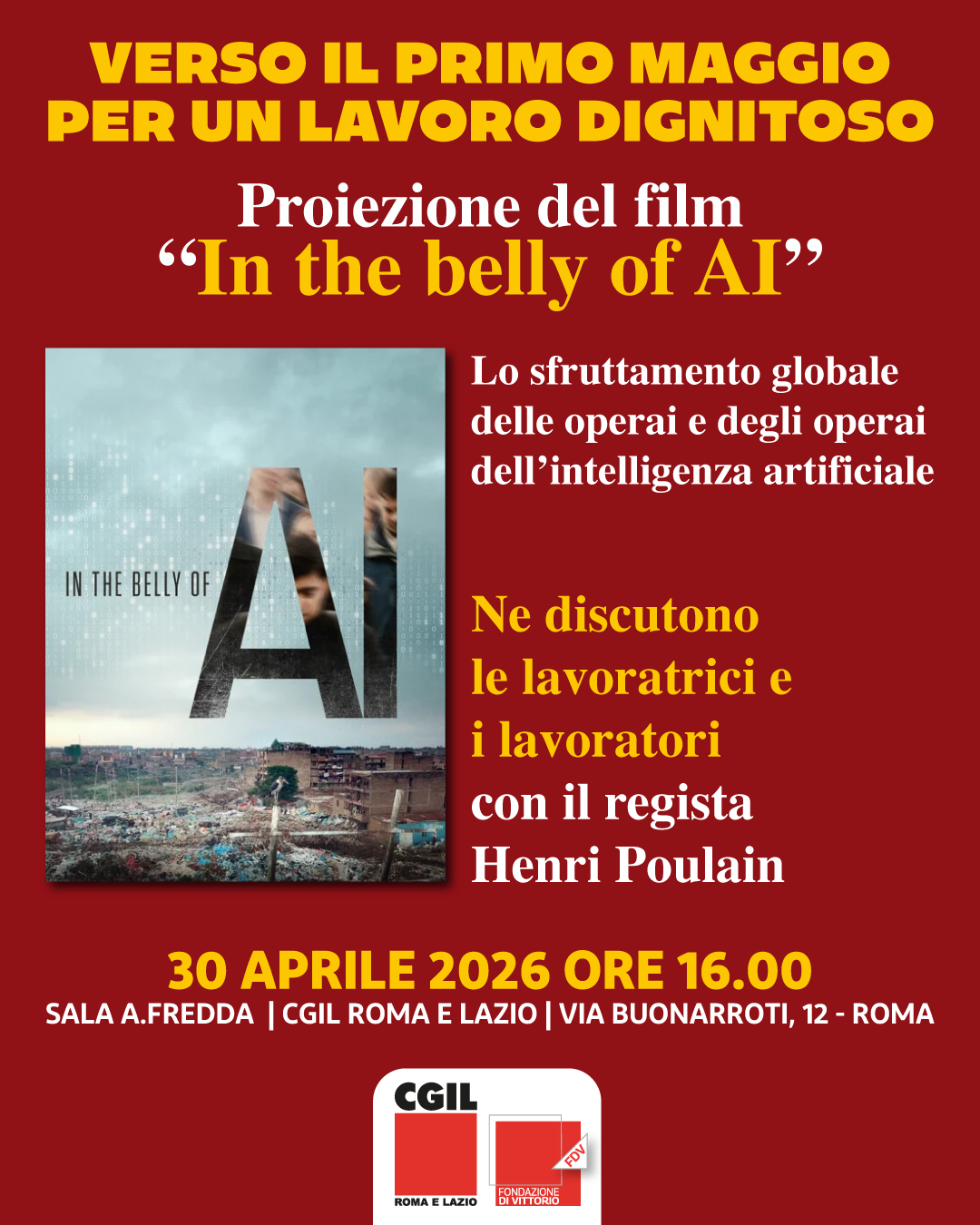 Il 30 aprile 2026, alle ore 16.00, presso la Sala A. Fredda della Cgil Roma e Lazio, in via Buonarroti 12 a Roma, si terrà la proiezione di In the belly of AI, documentario dedicato alle condizioni di sfruttamento globale delle operaie e degli operai dell’intelligenza artificiale, alla presenza del regista Henri Poulain.