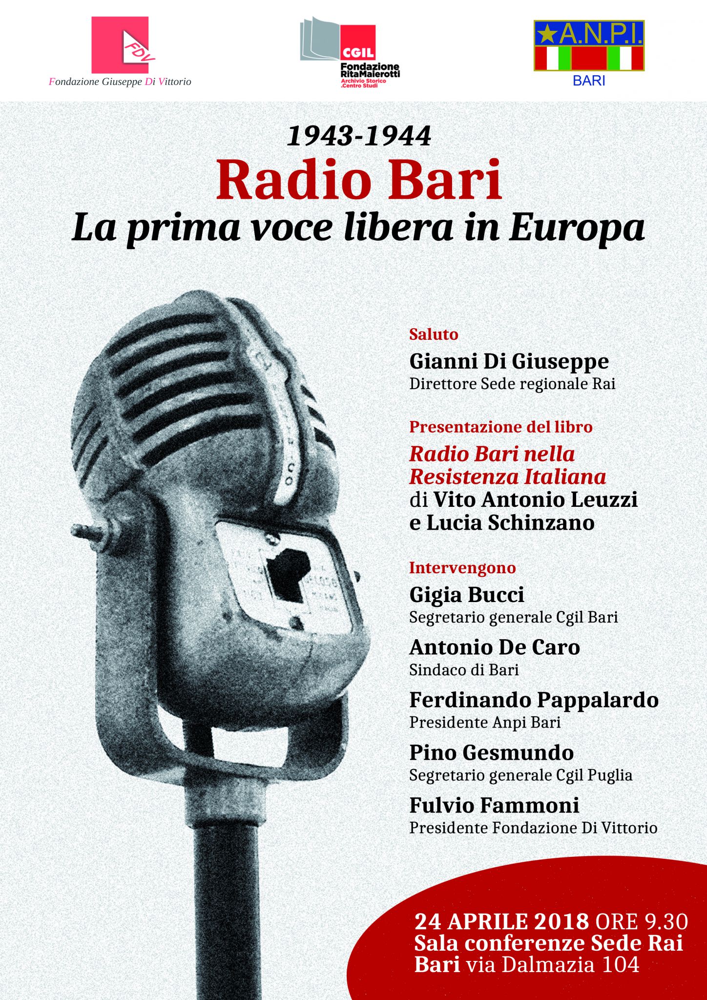 Il Presidente della Fondazione Di Vittorio, Fulvio Fammoni, interverrà alla presentazione del volume "Radio Bari nella Resistenza italiana" di Vito Antonio Leuzzi e Lucia Schinzano (Edizioni dal Sud), in programma il 24 aprile 2018 (ore 9,30) presso la sede Rai di Bari di via Dalmazia 104.