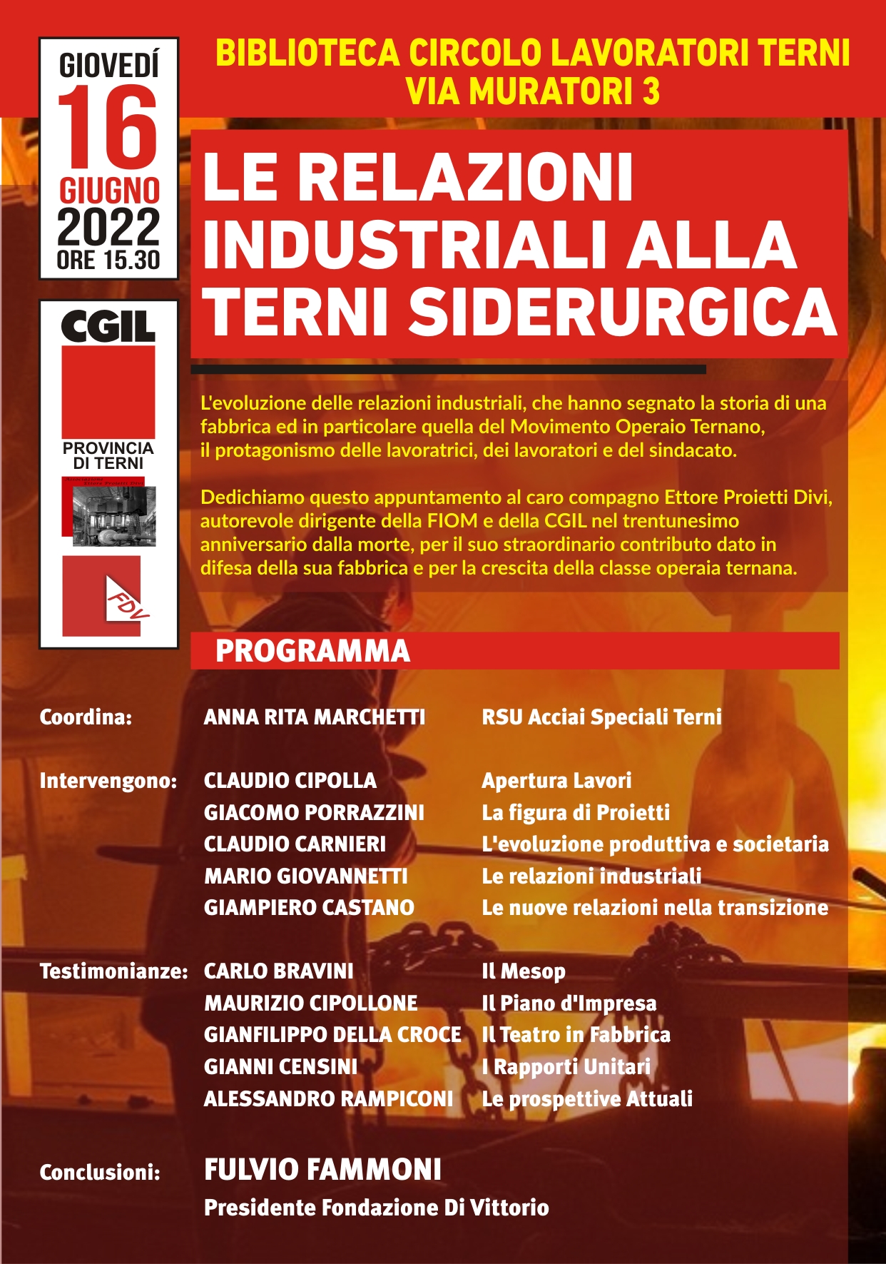 Giovedì 16 giugno 2022 ore 15.30, presso la Biblioteca Circolo Lavoratori Terni, in via Muratori n.3, in occasione del 31esimo anniversario della scomparsa del compagno Ettore Proietti Divi, Cgil Terni e FDV organizzano l'iniziativa dal titolo "Le relazioni industriali alla Terni siderurgica". Le conclusioni sono affidate al presidente della Fondazione Di Vittorio Fulvio Fammoni.