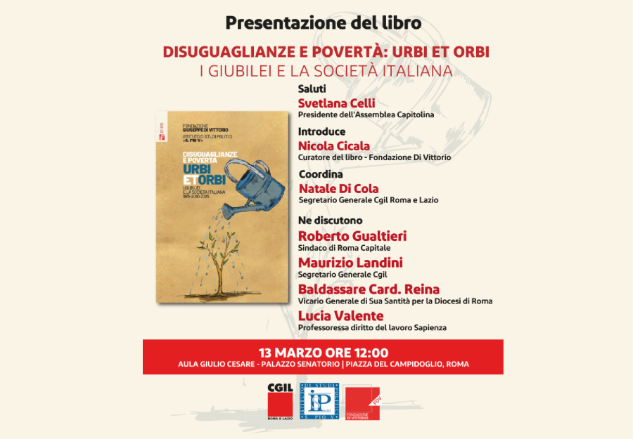 Nell’Aula Giulio Cesare – Palazzo Senatorio, in piazza del Campidoglio a Roma, la presentazione del volume Disuguaglanze e povertà. Urbi et Orbi. I giubilei e la società italiana 1975-2000-2025 (Futura editrice, pp. 230, euro 15) ha raccolto numeroso pubblico e le tante voci che compongono questo libro, frutto del lavoro fortemente voluto dalla Fondazione Giuseppe Di Vittorio e dall’Istituto S. Pio V, con il contributo di studiosi che hanno concentrato le loro rispettive ricerche su due specifici temi, le disuguaglianze e la povertà, attraverso una lettura storica dell’ultimo mezzo secolo, e una rigorosa analisi di numeri e dati.