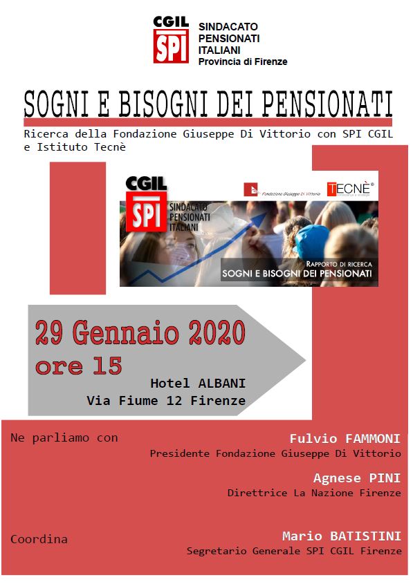 La ricerca "Sogni e bisogni dei pensionati", realizzata dalla Fondazione Di Vittorio, SPI CGIL e l'istituto Tecnè, sarà presentata a Firenze all'iniziativa organzzata da SPI CGIL Firenze, in programma mercoledì 29 gennaio, dalle ore 15 presso l'Hotel Albani (Via Fiume 12).