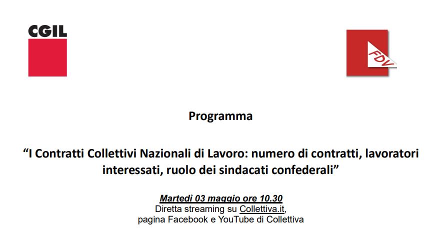 La CGIL e la Fondazione Di Vittorio organizzano, per martedì 3 maggio 2022 dalle ore 10.30, un webinar dal titolo "I Contratti Collettivi Nazionali di Lavoro: numero di contratti, lavoratori interessati, ruolo dei sindacati confederali".